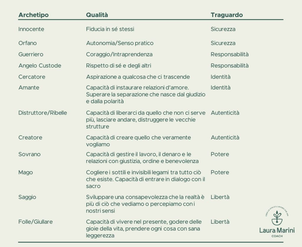 Nella tabella sottostante sono elencati i 12 archetipi della personalità identificati da Carl Gustav Jung. A fianco ad ogni archetipo ho indicato la qualità – l’aspetto positivo che lo caratterizza – e il traguardo che ogni archetipo consente di raggiungere.